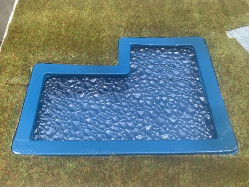 Ready to place pond. Suitable for HO to 0 scale. No messy pouring or cutting out needed to instal but does have an illusion of depth. Just place on a flat surface. Approximately 33cmx23cm. USA$16/A$25. Each one is a little different in terms of grass/dirt covering at the sides as this is done by hand.